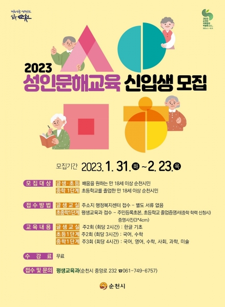 [금요저널] 순천시는 오는 23일까지 2023년 성인 문해 학교 신입생을 모집한다.
