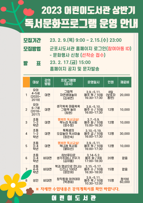 프로그램은 3.7.부터 5.19.까지 운영되며 개별 프로그램의 운영 내용, 시작 일자, 종료 일자는 군포시 도서관 홈페이지에서 확인할 수 있다.