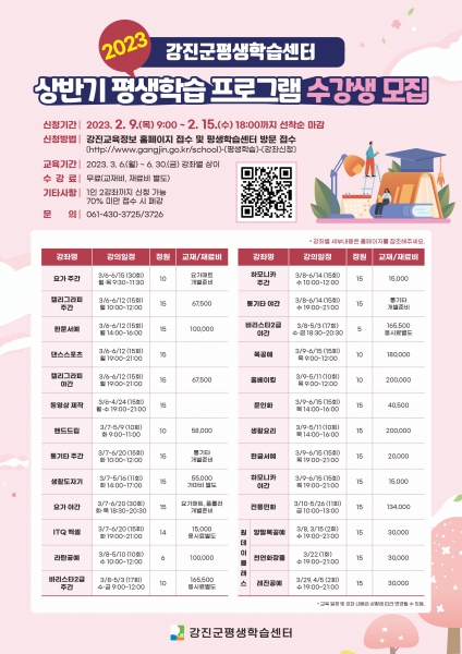 [금요저널] 강진군 평생학습센터가 오는 15일까지 2023년 상반기 평생학습 수강생을 선착순 모집한다.