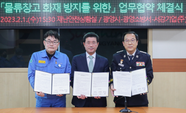 [금요저널] 광양시는 1일 시청 재난안전상황실에서 광양소방서 서강기업㈜과‘물류창고 화재방지 및 피해 최소화를 위한’삼자 간업무협약을 체결했다.