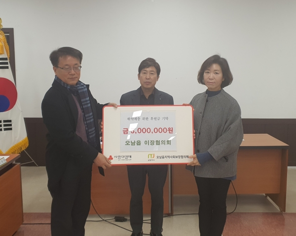 이날 전달된 후원금은 오남읍 이장협의회에서 직접 가꾼 텃밭에서 재배한 고구마 판매 수익금과 이장들이 십시일반으로 모은 성금으로 마련됐다.
