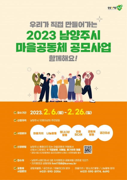 [금요저널] 남양주시는 주민 스스로 지역 문제를 해결하고 마을 발전과 삶의 질 향상을 위한 공동체 활동을 지원하고자 ‘2023년 마을공동체 공모 사업’을 추진한다.