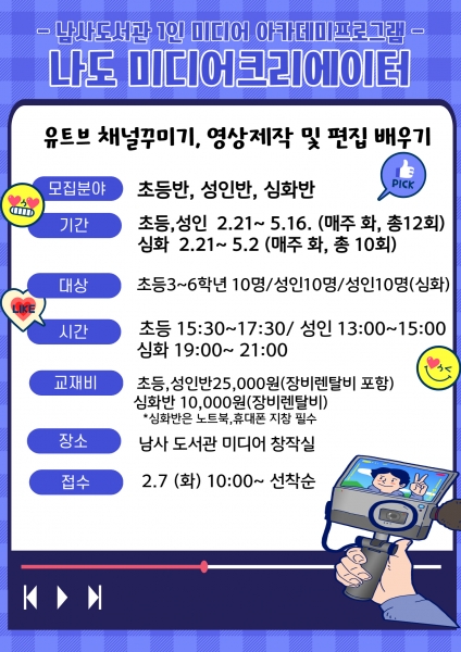 남사도서관 미디어창작실에서 열리는 이번 프로그램은 콘텐츠 기획부터 촬영, 영상편집 등 실습 위주의 맞춤형 강의로 진행된다.