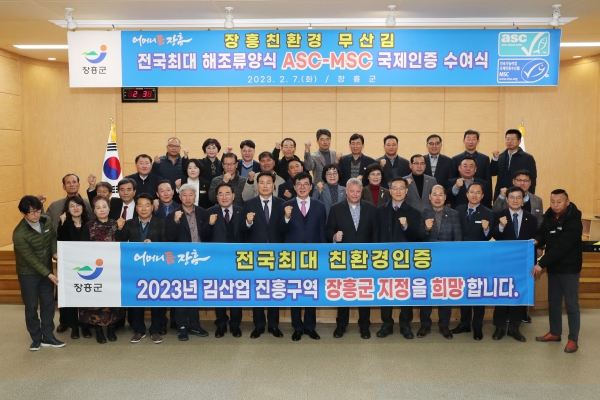 김성 장흥군수는 “친환경 무산김 판촉에 ASC-MSC 국제인증을 적극 활용하고 해외 대형 유통업체를 통한 수출증대에 노력하겠다”며 “친환경 어업을 확대해 지역민의 소득을 높이고 후손에게 깨끗한 바다를 물려주겠다”고 말했다.