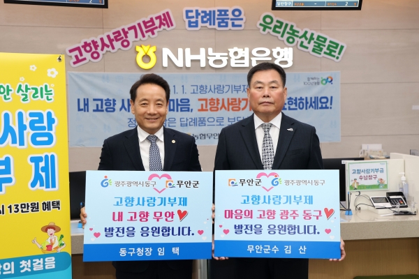 [금요저널] 김산 무안군수와 임택 광주 동구청장이 지난 7일 고향사랑기부제의 성공적인 정착을 위한 제도 활성화와 상생협력 강화를 위해 고향사랑기부금을 상호 지역에 기부했다.