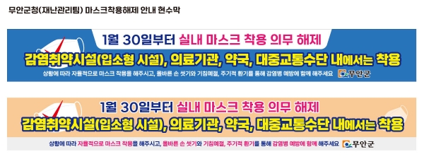 [금요저널] 전남 무안군은 30일부터 실내에서도 마스크를 자율적으로 착용하도록 전환됨에 따라 의료기관·대중교통 등 착용 의무를 2월 한 달간 특별 홍보하고 있다.
