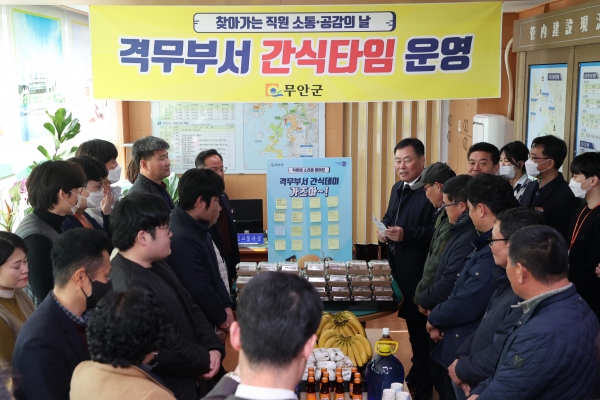 [금요저널] 전남 무안군은 지난 8일 직원 간 소통을 강화하고 긍정조직 문화형성을 위한 첫 걸음으로 찾아가는 ‘간식 가즈아 타임’을 가져 큰 화제가 되고 있다.