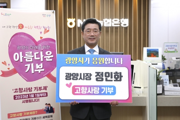 [금요저널] 정인화 광양시장은 고향사랑기부제 활성화를 위해 8일 농협은행 광양시청 출장소에서 경북 포항시, 경남 하동군, 서울 송파구, 경기도 파주시, 전남 신안군, 전북 남원시, 충남 당진시 등 7개 자매결연도시에 고향사랑기부금을 기탁했다고 밝혔다.