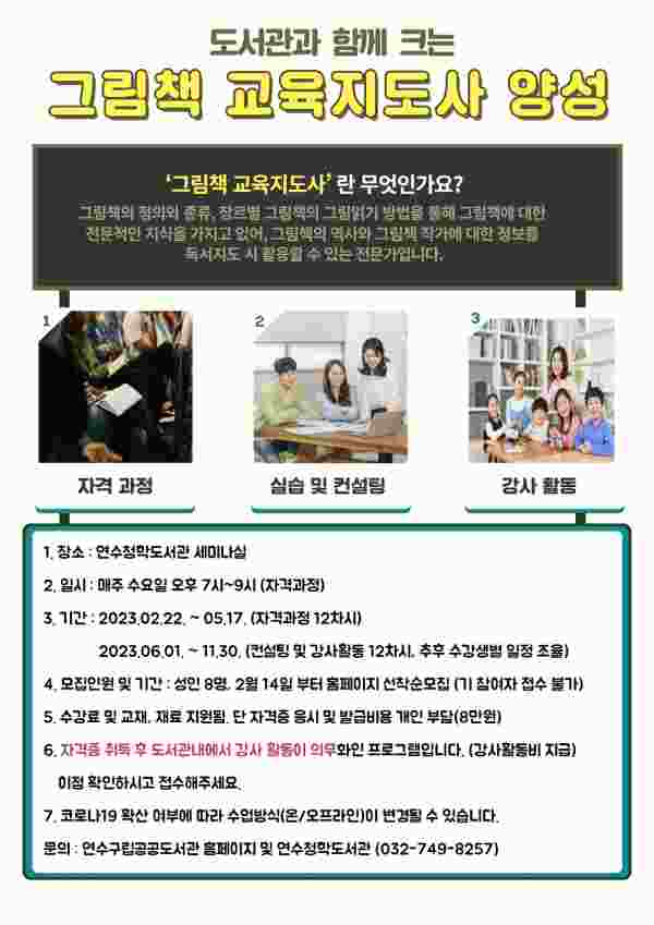 ‘그림책 교육 지도사 양성 과정’은 2월 14일부터 도서관 홈페이지에서 선착순으로 8명을 모집하며 기타 자세한 내용은 도서관 홈페이지를 참고하거나 연수청학도서관으로 문의하면 된다.