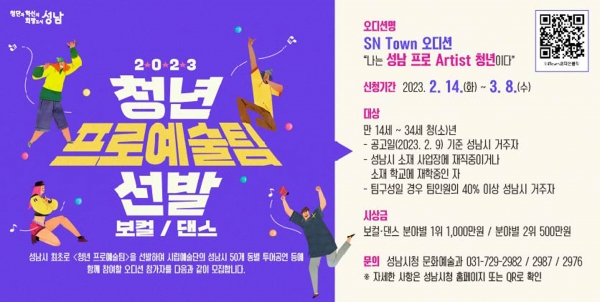 시는 댄스, 보컬 등 각 분야 5개 팀씩 모두 10개 팀을 선발하기로 하고 2월 14일부터 오는 3월 8일까지 ‘나는 성남 프로 아티스트 청년이다’ 오디션 참가자를 모집한다.