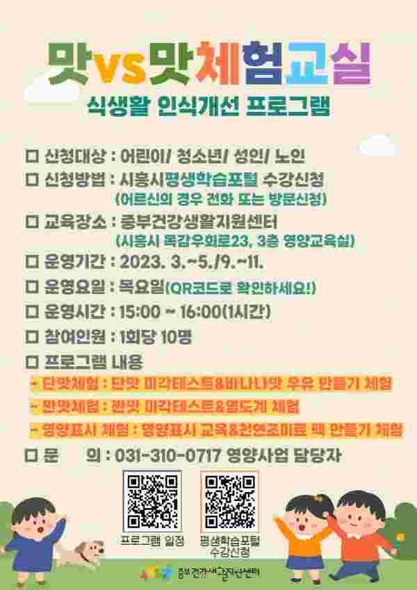 특히 식생활 인식개선을 위한 체험교실은 2023년 신규 프로그램인 ‘맛 vs 맛 체험교실’로 어린이·청소년·성인·노인을 대상으로 단맛체험 짠맛체험 영양표시체험 프로그램이 마련돼 있다.