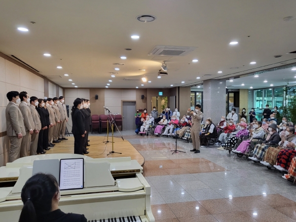 요양 중인 어르신 약 100여명을 대상으로 약 30분간 트로트 등의 가요와 대중음악을 선보이며 눈길을 끌었다.