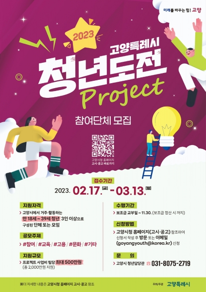 [금요저널] 고양특례시에서 청년도전 프로젝트에 참여할 청년 단체 및 모임을 2월 17일부터 3월 13일까지 공개 모집한다.