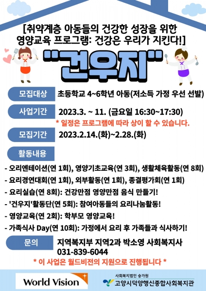[금요저널] 고양시덕양행신종합사회복지관에서는 월드비전의 지원을 받아 취약계층 아동의 식생활개선을 통한 건강한 성장 도모를 위해 ‘건우지’ 프로그램을 진행한다.