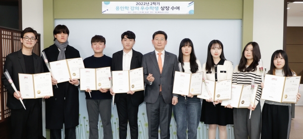[금요저널] 이상일 용인특례시장은 20일 시장실에서 관내 대학 교양 과목으로 개설된 2022년 2학기 '용인학' 강좌를 수강한 우수 학생 9명에게 상장을 수여했다.