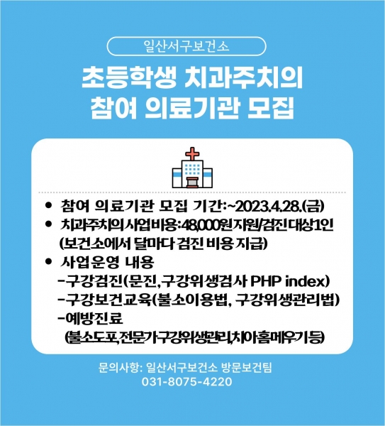 [금요저널] 고양특례시 일산서구보건소가 ‘경기도 초등학생 치과주치의 사업’에 참여할 치과 병·의원을 4월 28일까지 모집한다.