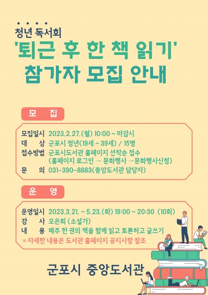[금요저널] 군포시 중앙도서관은 지역의 청년을 대상으로 책을 통해 소통하고 공감하며 성장하는 독서문화 정착 및 성숙한 문화시민을 양성하고자 청년독서회 ‘퇴근 후 한 책 읽기’를 오는 3월부터 운영한다고 밝혔다.