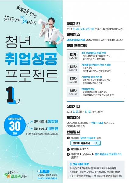 [금요저널] 남양주시는 2023년 취업 지원 프로그램의 일환으로 오는 3월 20일부터 ‘청년 취업 성공 프로젝트 1기’를 운영한다고 21일 밝혔다.