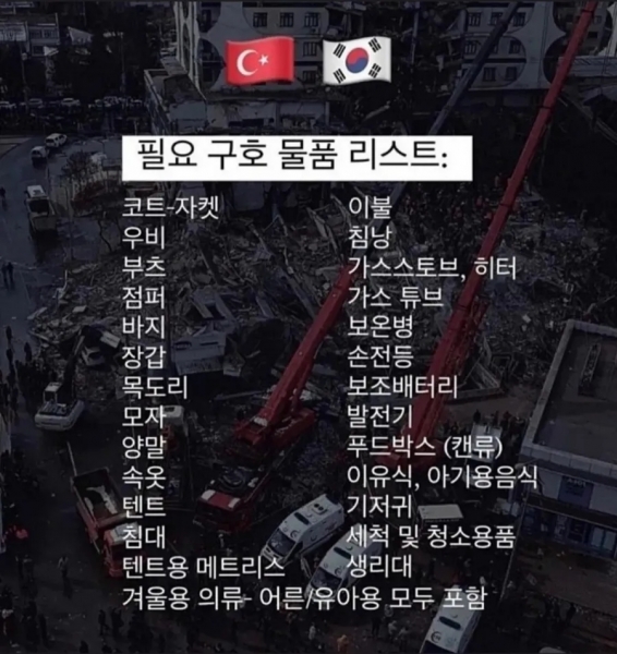 주한 튀르키예 대사관 관계자는 “현재 지진으로 집을 잃은 사람이 많아 옷보다는 텐트, 이불, 전기 히터, 침낭, 보온병, 겨울점퍼, 바지, 목도리, 장갑, 양말, 겨울모자 등이 필요한 상황이다”며 “위생 문제도 있어 손소독제, 마스크, 물티슈, 생리대, 기저귀 등의 위생용품도 보내주시면 감사할 것 같다”고 전했다.