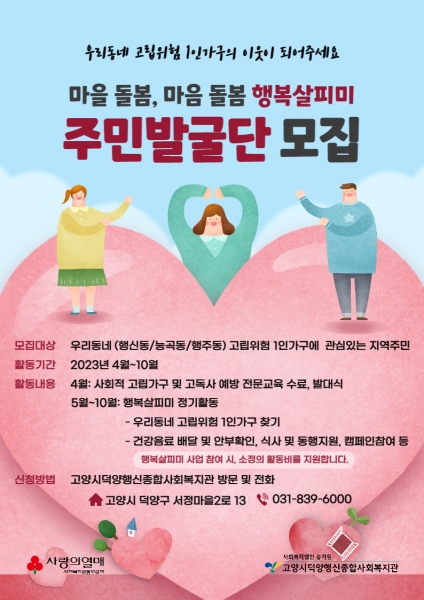 [금요저널] 고양시 덕양행신종합사회복지관에서 ‘마음돌봄 행복살피미’ 사업을 함께할 주민발굴단을 모집한다.