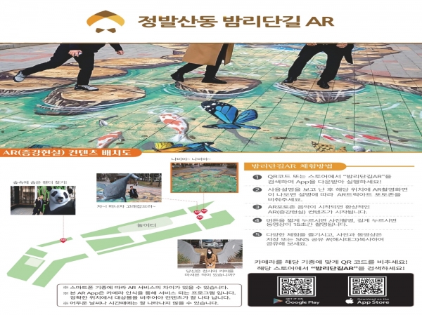 한편 정발산동 밤가시 제2공원에 설치한 증강현실을 즐기는 방법은 구글플레이스토어나 앱스토어에서 ‘밤리단길AR’을 다운·설치 스마트폰 볼륨을 높이고 AR포토존을 비춘 뒤 AR음악이 시작되면서 증강현실 컨텐츠가 나타나면 사진이나 동영상을 찍으면 된다.