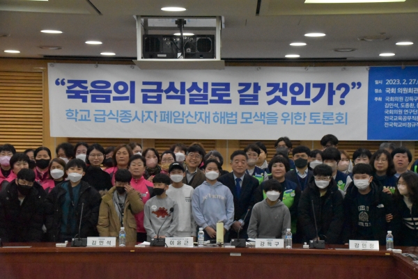 [금요저널] 국회 교육위원회 소속인 강득구 의원과 전국교육공무직본부, 전국학교비정규직노동조합 그리고 강민정·김민석·도종환·문정복 의원은 27일 오전 10시, 국회 의원회관 제2세미나실에서 ‘죽음의 급식실로 갈 것인가? 학교 급식종사자 폐암 산재, 다각적인 해법 모색을 위한 토론회’를 개최했다.