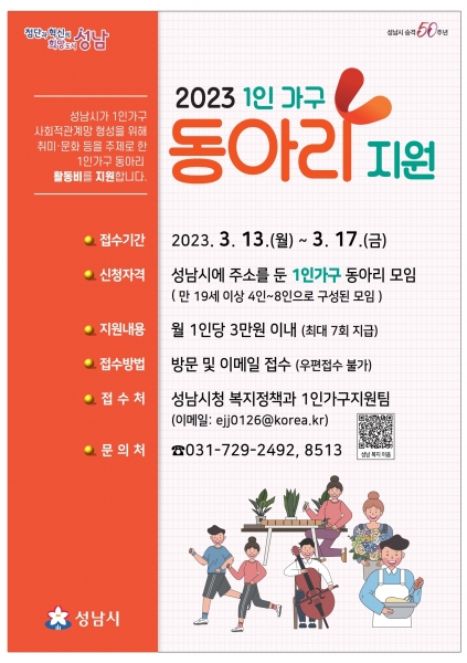 신청 자격은 만 19세 이상의 성남시민 4~8명이 모여 취미·여가·문화 등의 활동을 하는 1인 가구들의 모임이다.