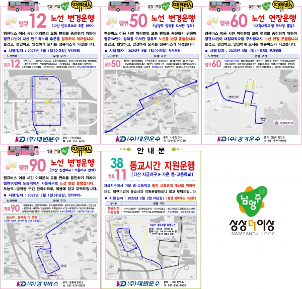 이번 노선 개편으로 땡큐11번은 지금지구 내 가운고등학교 재학생의 등교를 위해 등교 시간에 1회 가운지구를 경유하며 땡큐60번은 노선 연장과 함께 광릉테크노밸리에서 대경대학교서울한류캠퍼스로 종점이 변경돼 학생들에게 이동 편의를 제공한다.