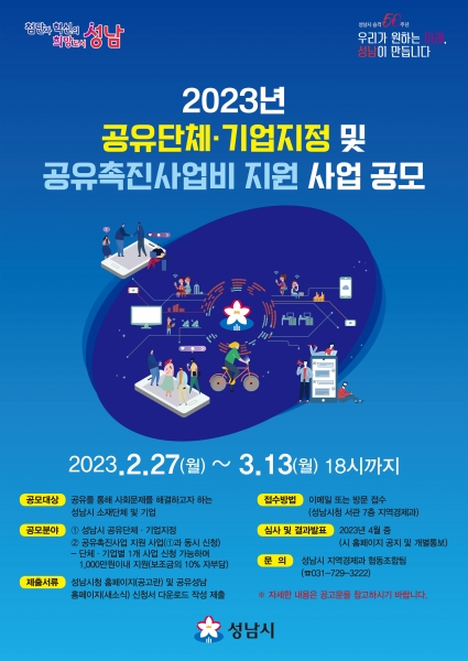 공모 참여 자격은 공유 사업을 최근 6개월 이상 한 이력이 있는 성남지역 소재 비영리 민간단체, 법인, 기업이다.