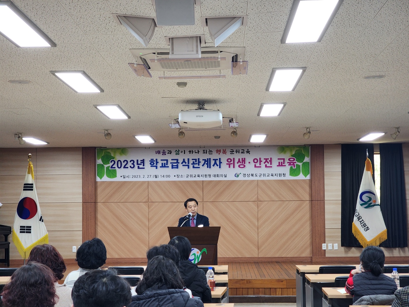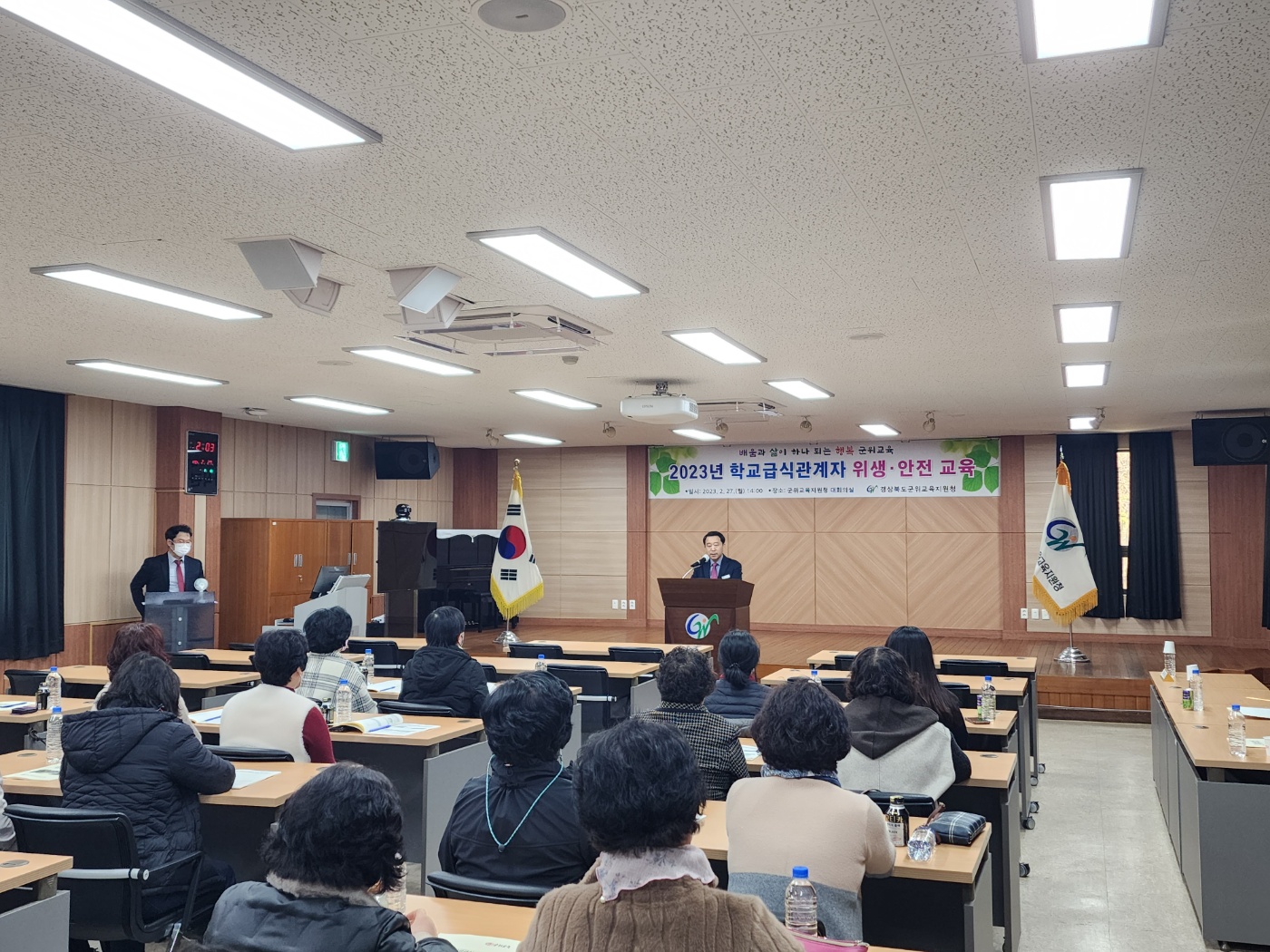 경상북도군위교육지원청(교육장 송경란)은 2. 27.(화) 군위교육지원청 대회의실에서 군위 관내 각급 학교 조리종사자와 학교급식점검단을 대상으로 신학기 개학을 앞두고 학교급식 위생․안전 교육을 실시하여, 군위군의 대구광역시 편입 과도기에 식중독과 안전사고에 선제적으로 대비하고 있다.