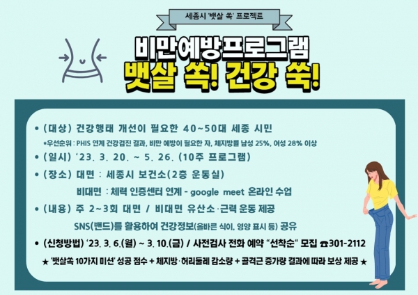 [금요저널] 세종시보건소가 40∼50대 중년을 대상으로 비만 예방·관리를 위한 ‘뱃살 쏙 건강 쑥’ 프로그램을 운영한다.