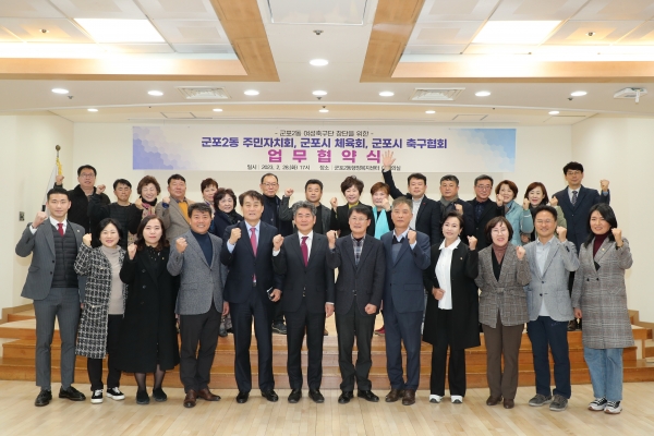 [금요저널] 군포2동 주민자치회는 지난 2월 28일 행정복지센터 대회의실에서 군포시 체육회 및 군포시 축구협회와 군포2동 여성축구단 창단 지원을 위한 업무협약식을 체결했다.