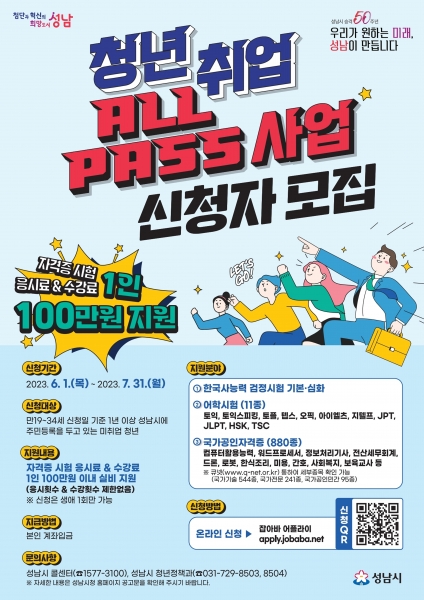 대상은 성남시에 1년 이상 거주한 만 19세 이상 34세 이하의 모든 미취업 청년이며 올해 1월 1일 이후 시험 응시 또는 수강자가 해당한다.