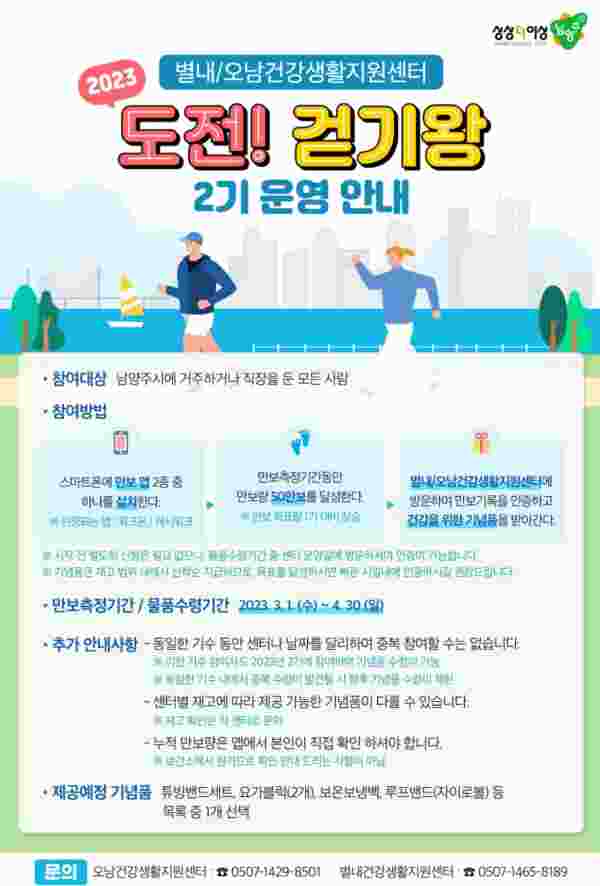 목표를 달성한 참여자는 전화 문의 후 별내·오남건강생활지원센터에 방문해 목표 달성을 인증할 수 있으며 이 중 선착순 200명에게 소정의 기념품을 제공할 예정이다.