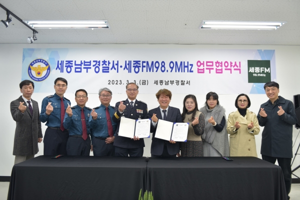 [금요저널] 세종남부경찰서는 2023. 3. 3. 11:00 세종FM98.9MHz 세미나실에서 따뜻한 공동체 치안 구현을 위해 세종FM98.9MHz과 업무협약식을 개최했다.