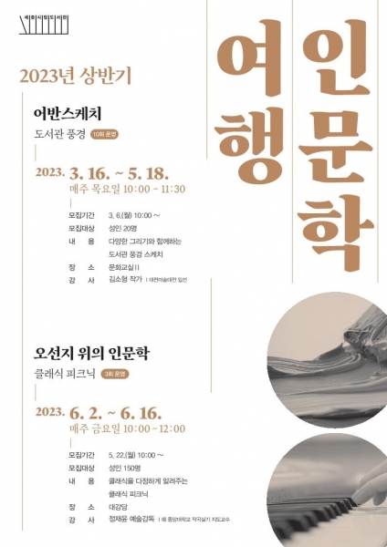 프로그램별 세부 일정 확인 및 신청은 세종시립도서관 누리집을 통해 가능하며 어반스케치는 오는 6일 10시부터, 오선지 위의 인문학은 5월 22일 10시부터 선착순 접수한다.