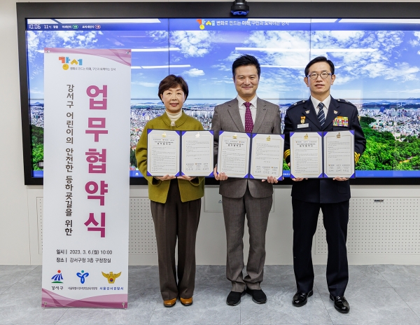 [금요저널] 전국 최초로 ‘공무원 어린이 안심등교 기동반’을 운영 중인 서울 강서구가 6일 강서경찰서 강서양천교육지원청과 안전한 등하굣길 조성을 위한 업무협약을 체결했다.