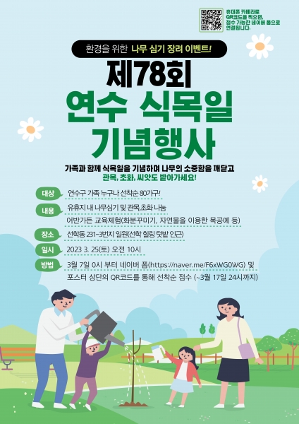 이번 제78회 연수식목일 행사는 오는 3월 25일 토요일 선학동 231-3번지 일원에서 오전 10시부터 12시까지 열린다.