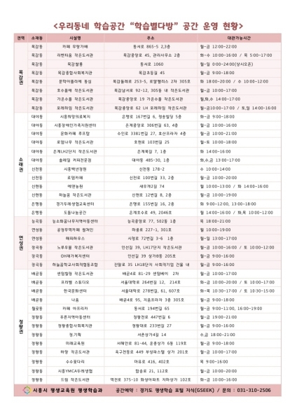 시 관계자는 “시설주에게는 지역 커뮤니티 공간으로서의 홍보 효과를, 시민에게는 학습공간 활용을 통한 평생학습 생활화의 효과를 창출하는 평생교육의 선순환이 이뤄지길 바란다”고 전했다.