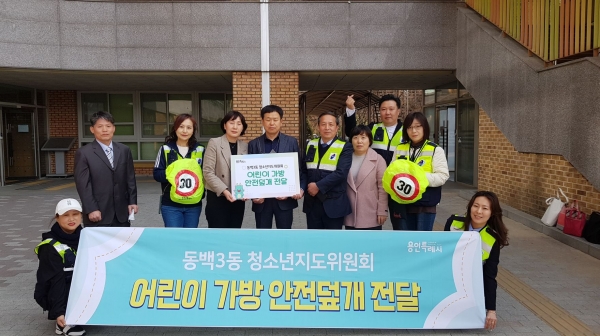 김장욱 동백3동 청소년지도위원회 위원장은 "눈에 잘 띄는 가방 덮개가 어린이들이 안전하게 다닐 수 있는데 보탬이 되길 바란다"며 "앞으로도 우리 미래 세대가 건강하게 성장할 수 있도록 지원을 아끼지 않겠다"고 말했다.