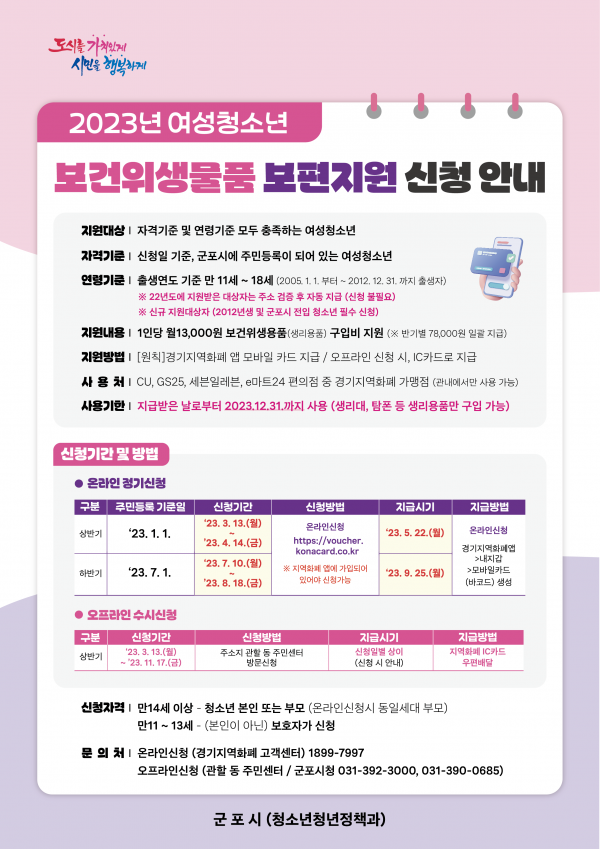 [금요저널] 군포시는 2022년에 이어 2023년에도 만 11세~18세의 관내 여성청소년에게 여성청소년 보건위생물품 구입비를 지원한다고 밝혔다.