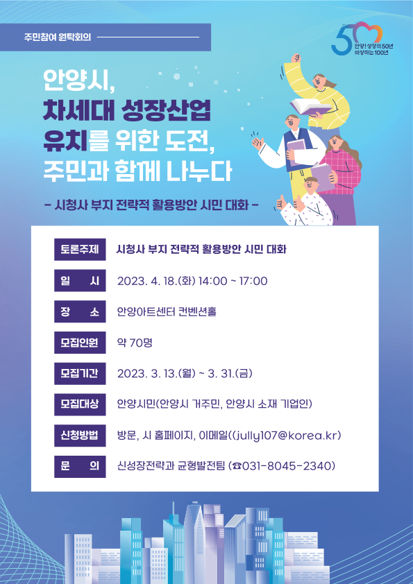 이번 원탁회의는 시 승격 50주년을 맞아 시의 현재 모습과 100년 미래도시 도약의 필요성과 방향, 청사 부지의 전략적 활용방안에 관해 시민들과 소통하고자 오는 4월 18일 안양아트센터에서 원탁회의를 개최한다.