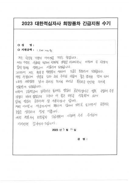 문은수 회장은 “A씨와 같이 실질적으로 도움이 필요한 긴급 위기가정을 위해 ‘희망풍차 위기가정 긴급지원’ 프로그램을 운영하고 있다”며 “후원해주시는 적십자회비와 기부금은 우리 사회의 소외된 이웃에 전달되니 많은 관심과 참여 부탁드린다”고 말했다.