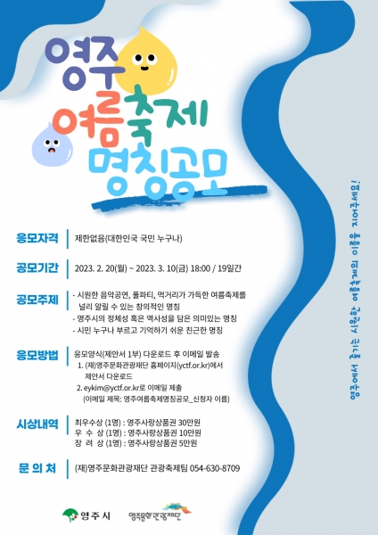 김덕우 영주문화관광재단 대표이사는 “2023영주 여름축제 명칭 공모에 보여주신 뜨거운 관심에 감사드리며 7월 29일부터 8월 6일까지 9일간 영주시 전역에서 개최될 여름축제에 많은 응원과 참여 부탁드린다”며 “기존과 차별화된 프로그램과 콘텐츠로 관광문화를 활성화하고 영주가 가지고 있는 유무형의 자산을 활용해 더 높이 도약하는 축제를 만들겠다”고 밝혔다.