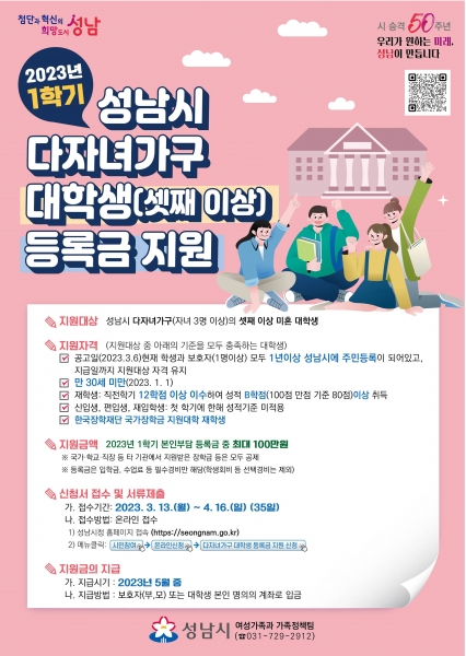 성남시, 다자녀가구 셋째 이상 대학생에 등록금 지원