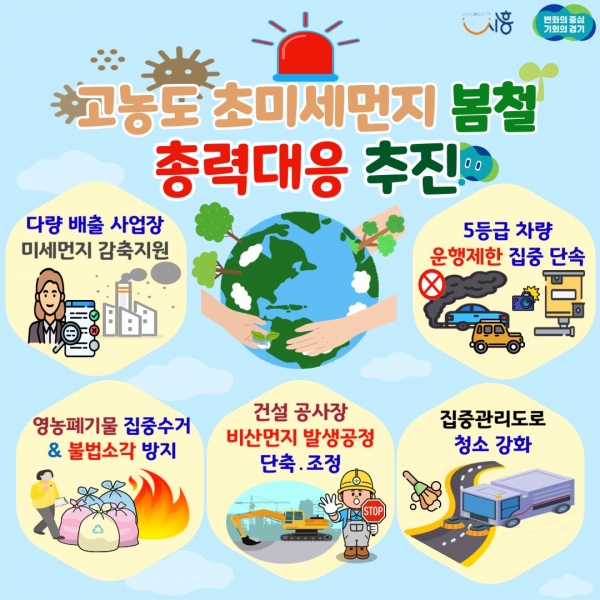 [금요저널] 시흥시는 연중 초미세먼지 농도가 가장 높고 ‘나쁨 일수’ 발생 빈도가 가장 잦은 3월 한 달간을 ‘초미세먼지 봄철 총력대응 기간’으로 설정하고 대응 방안을 강력히 추진한다.