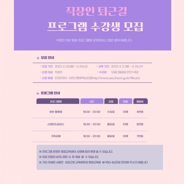 [금요저널] 서천군이 오는 20일부터 24일까지 ‘2023년 직장인 퇴근길 프로그램’ 수강생을 모집한다.