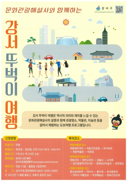 투어는 매주 화요일~일요일 오전 10시부터 코스당 약 3시간 동안 진행되며 출발 7일 전까지 ‘강서구 문화관광 홈페이지-관광/명소-문화관광해설사 예약’에서 신청하면 된다.