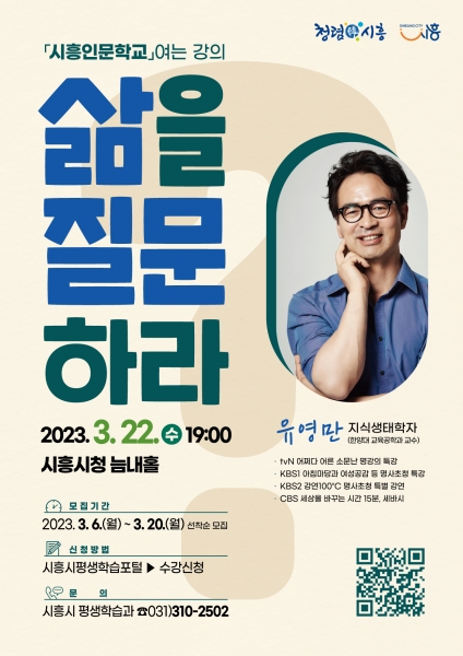 먼저 ‘시흥인문학교’ 여는 강의는 유영만 지식생태학자를 초청해 ‘삶을 질문하라’라는 주제로 오는 22일 19시부터 오후 9시까지 시흥시청 늠내홀에서 강의가 진행된다.