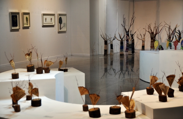 작품은 한지, 대나무, 삼나무, 폐기 섬유, 실, 커피 필터 등을 소재로 나무를 다채롭게 표현한다.